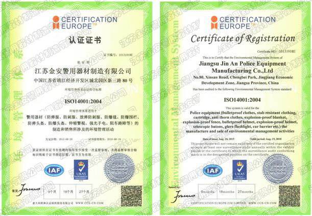 第一批新型單警裝備定點生產企業 公安部警用裝備采購中心協議供貨單位 公安部防彈防刺服生產定點企業 江蘇省公安廳防彈衣入圍企業 江蘇警用裝備行業協會會員單位 中國刑事科學技術協會團隊會員單位 中國安全防范產品行業協會會員單位 靖江市保安器材行業協會常務理事單位 全國警用裝備標準化技術委員會通訊委員 江蘇金安警用器材制造有限公司始創于九十年代初,公安部防彈防刺服生產定點企業、公安部警用裝備采購中心2..
